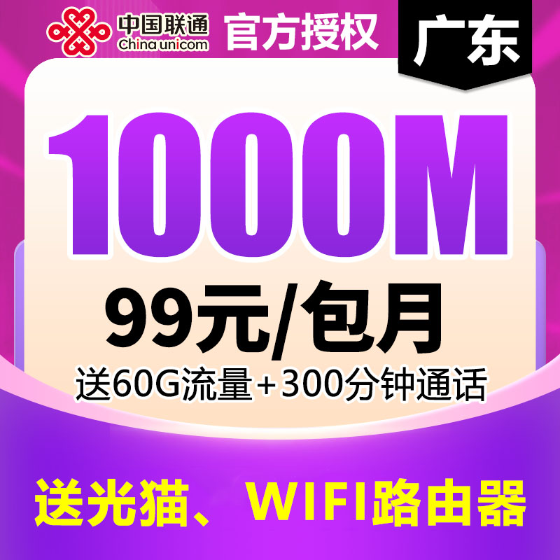 广东联通宽带1000M宽带99元/月(送手机卡含每月60G流量+300分钟通话)