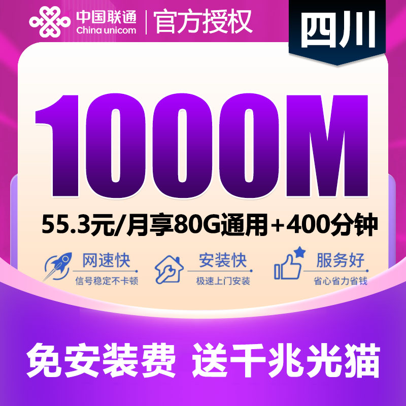 四川成都联通融合宽带1000M/55元包月(送5G手机卡含80G通用流量+400分钟通话)