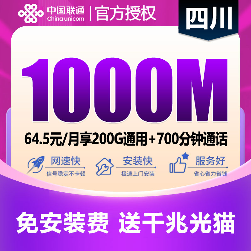【四川成都专享宽带】1000M联通融合宽带/65元包月(送5G手机卡含200G通用流量+700分钟通话)