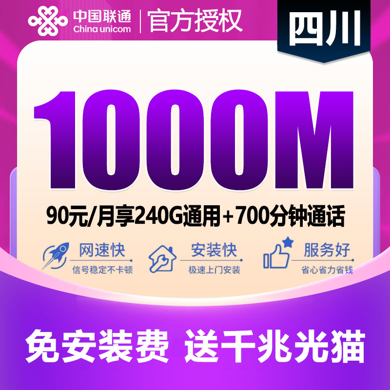 四川联通融合宽带1000M/90元包月(送5G手机卡含240G通用流量+700分钟通话)